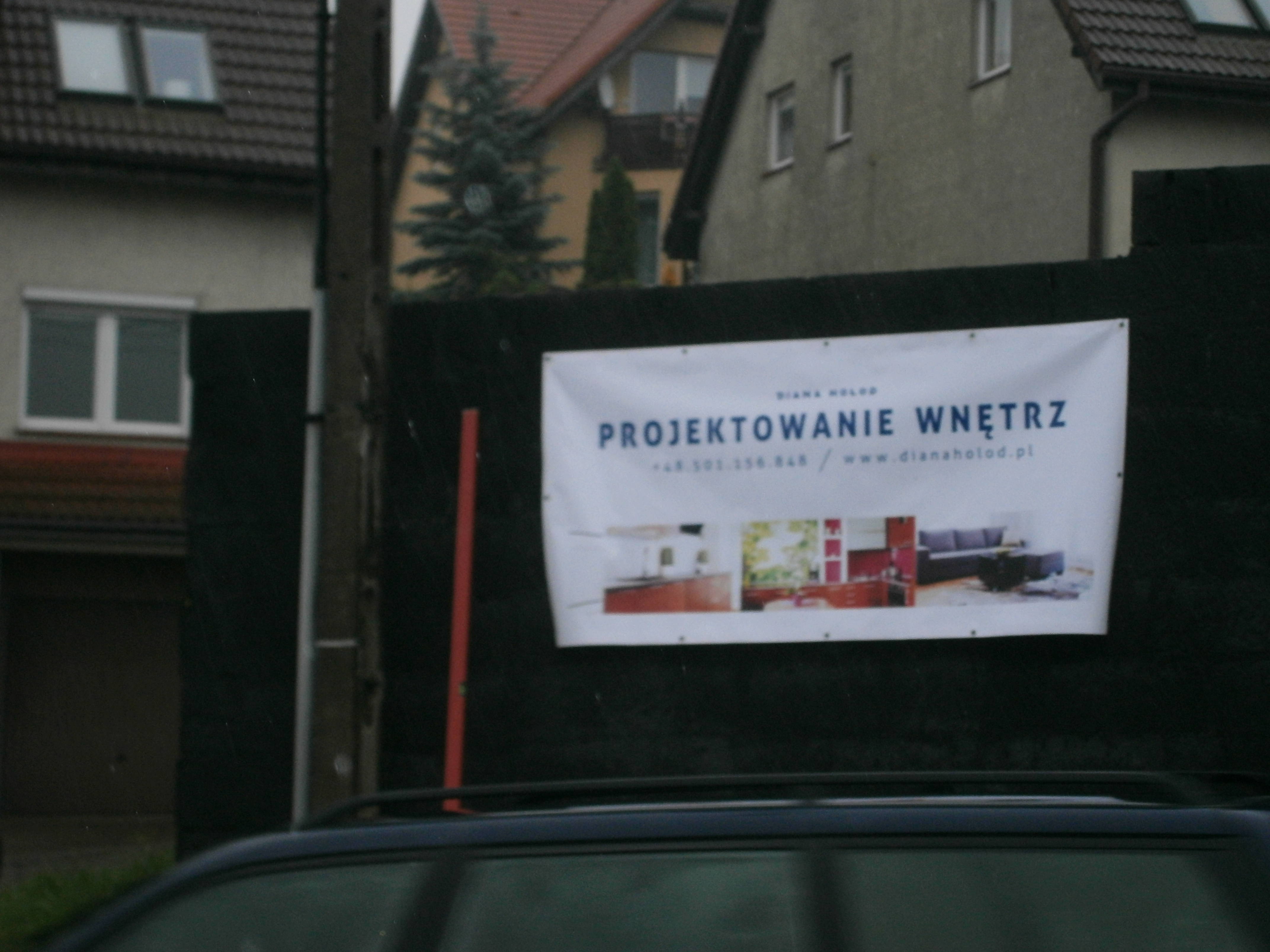 Zadanie konkursowe jest proste – proszę podać dokładnie miejsce, gdzie wisi mój banner (może być opisowo, adresu sama nie znam). Absolutnie nie proszę o przysłanie zdjęcia, bo to tuż przy ulicy więc niebezpiecznie jest tam pomykać z aparatem. Opis wystarczy. Konkurs jest otwarty dla wszystkich (oprócz moich drogich Sióstr oraz równie drogiego Szwagra, bo im chyba mówiłam), największe szanse zapewne mają Czytelnicy z Trójmiasta. Dla ułatwienia dodaję zdjęcie nieco oddalone, tak że widać częściowo budynki w tle.