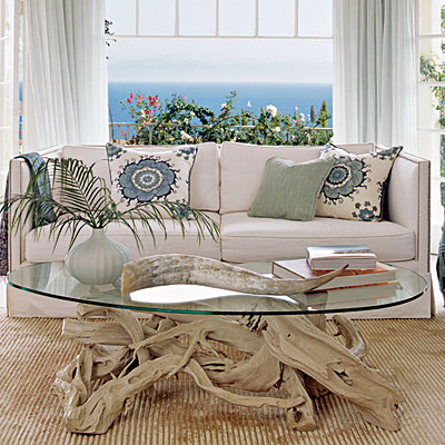Do napisania tego postu zainspirował mnie niedawny spacer nad morzem. Na plaży po burzy sporo było wypłukanego, wyszlifowanego przez wodę drewna. Jako element dekoracyjny takie sprane drewno pojawia się często w stylizacjach marynistycznych, razem z białą boazerią, żaglowym płótnem oraz dywanami z trawy morskiej. Jest to jeden z bliskich mi stylów, ale myślę sobie, że sprane drewno dobrze odnajdzie się także na przykład w bardzo minimalistycznym wnętrzu o prostych, wyrazistych liniach (i kolorach – widziałabym je na przykład w towarzystwie grafitu i starego złota). W takim zestawieniu wniosłoby trochę dynamicznej, organicznej formy do poukładanego, wyrównanego wnętrza.
