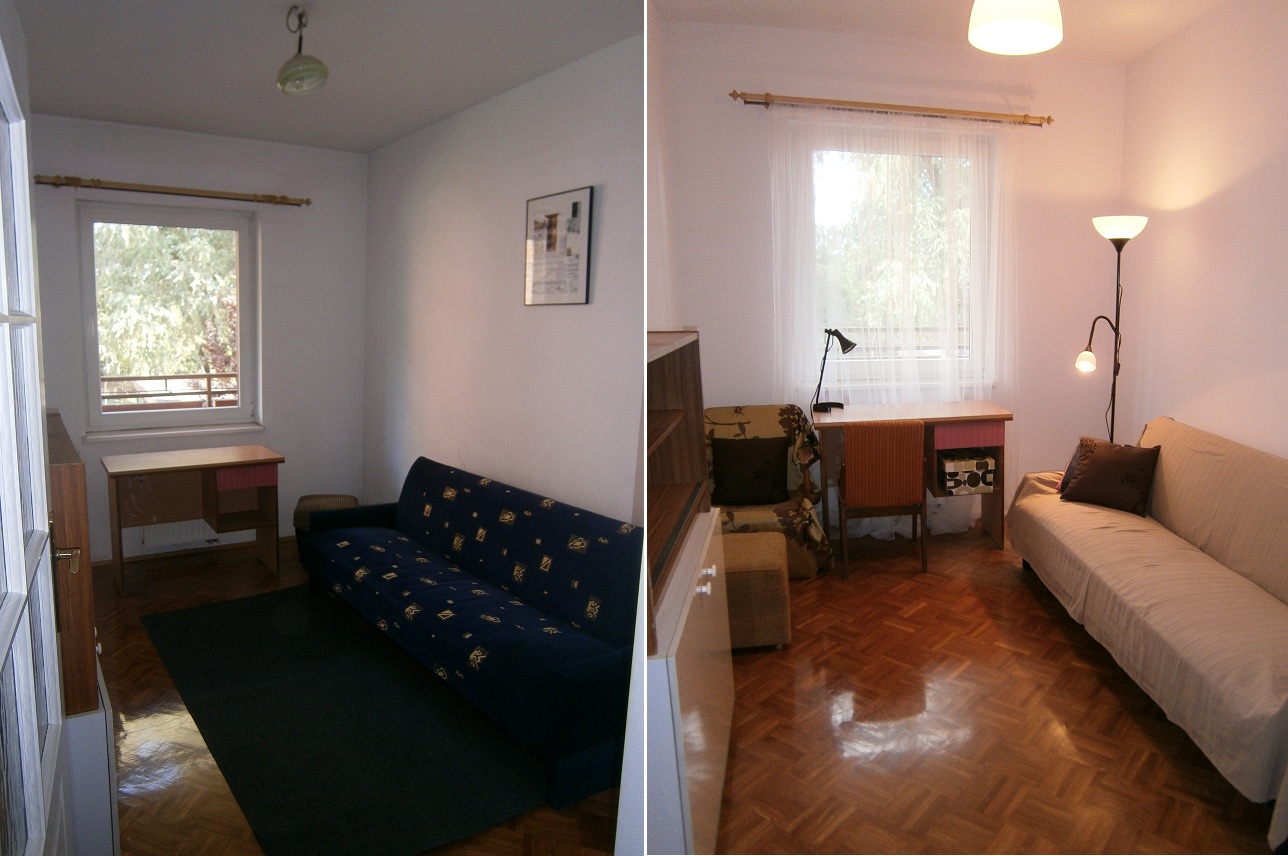 Na początek kilka informacji – mieszkanie dwupokojowe, w genialnej lokalizacji w Toruniu (7 minut na piechotę do Starówki), o bardzo dobrym rozkładzie (dwa pokoje, spory przedpokój, łazienka i kuchnia, w której można także posiedzieć), na zamkniętym osiedlu z ładnie zaaranżowaną zielenią, wynajęte za przystępne pieniądze. Idealne dla Studentów. Wyposażenie również bardzo, baaaaardzo studenckie – absolutnie wszystkie meble używane, w bardzo kiepskim stanie. Większość Studentów zapewne mieszkałaby tak jak zastała, zdecydowanie dało się mieszkać, ale skoro jedną z przyszłych mieszkańców jest moja kochana Siostra, uznałam że można przeprowadzić mały staging i nieco podnieść dziewczynom standard.