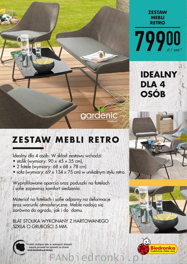 Nie spodziewałam się jednak nigdy że spodobają mi się meble z… Biedronki. A jednak. W obecnej ofercie sezonowej jest bardzo zgrabny komplet – sofa, dwa fotele i stolik ze szklanym blatem. Meble mogą stać zarówno wewnątrz, jak i na zewnątrz. Podoba mi się ich delikatna linia i cienkie nóżki. Wyglądają jak narysowane piórkiem i tuszem. Przy cenie 799 zł za cały komplet wydają się być niezłą okazją. Myślę że odnalazłyby się w wielu stylizacjach, ja najbardziej widziałabym do nich graficzną, biało-czarną z domieszką drewna i półtonów – jakieś szarobeżowe poduszki może. Zobaczcie sami jak wygląda ten zestaw. Dla mnie bomba!
