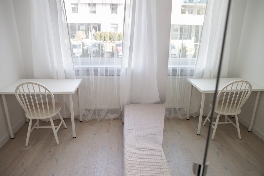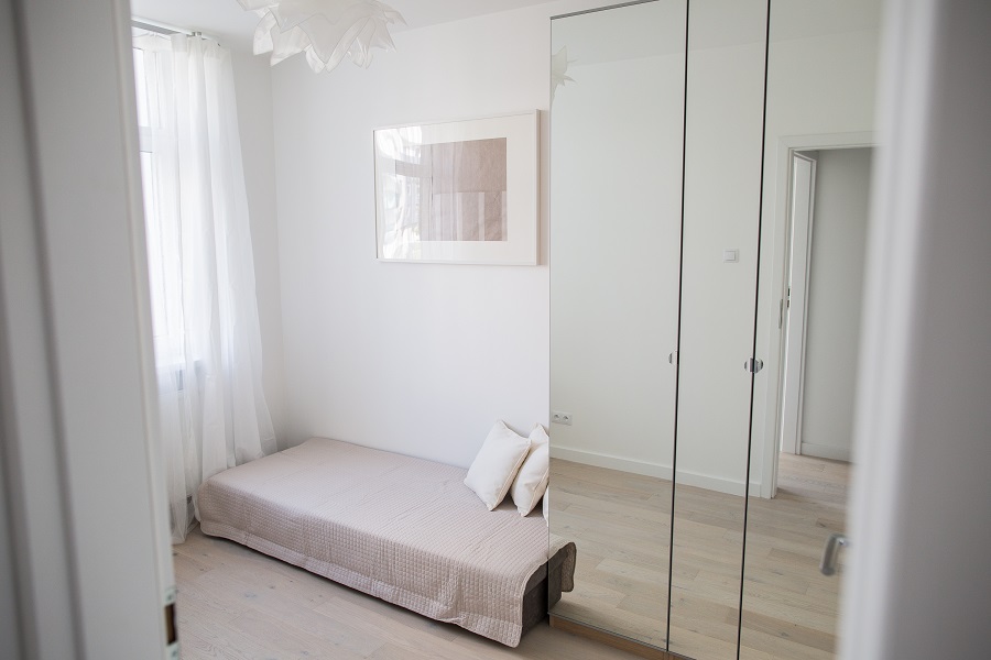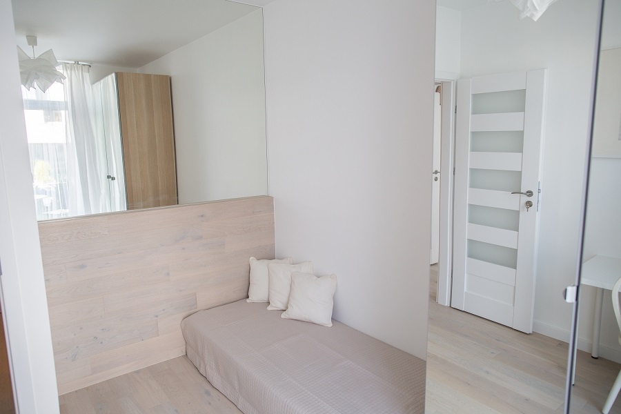 Po pierwsze, zmniejszyłam łazienkę do szerokości wanny (160 cm). Po drugie, dodałam przedpokój, z którego wchodzi się do sypialni – drzwi do sypialni mają spore przeszklenia, aby przedpokój był doświetlony. W mniejszej sypialni, która została przeznaczona dla mamy, nad wezgłowiem łóżka (wykonanym z desek podłogowych) znalazło się duże bezramowe lustro, które znacząco powiększa pokój. Łóżko może być złożone (gdy pokój ma stać się biurem) lub rozłożone – zmieści się nawet w szerokości 160 cm. Kuchnia została przeniesiona do dawnej sypialni, która stała się salonem.
