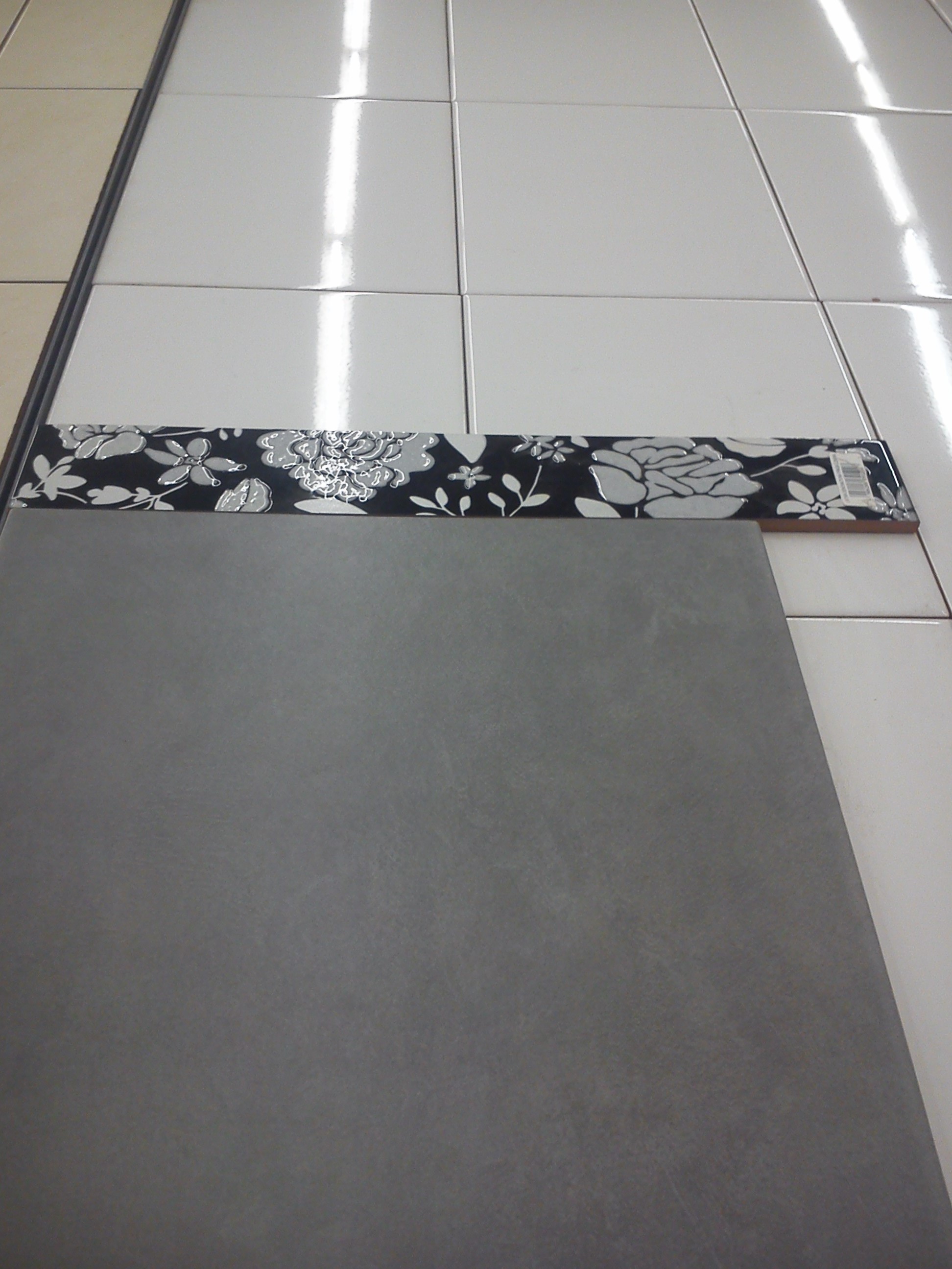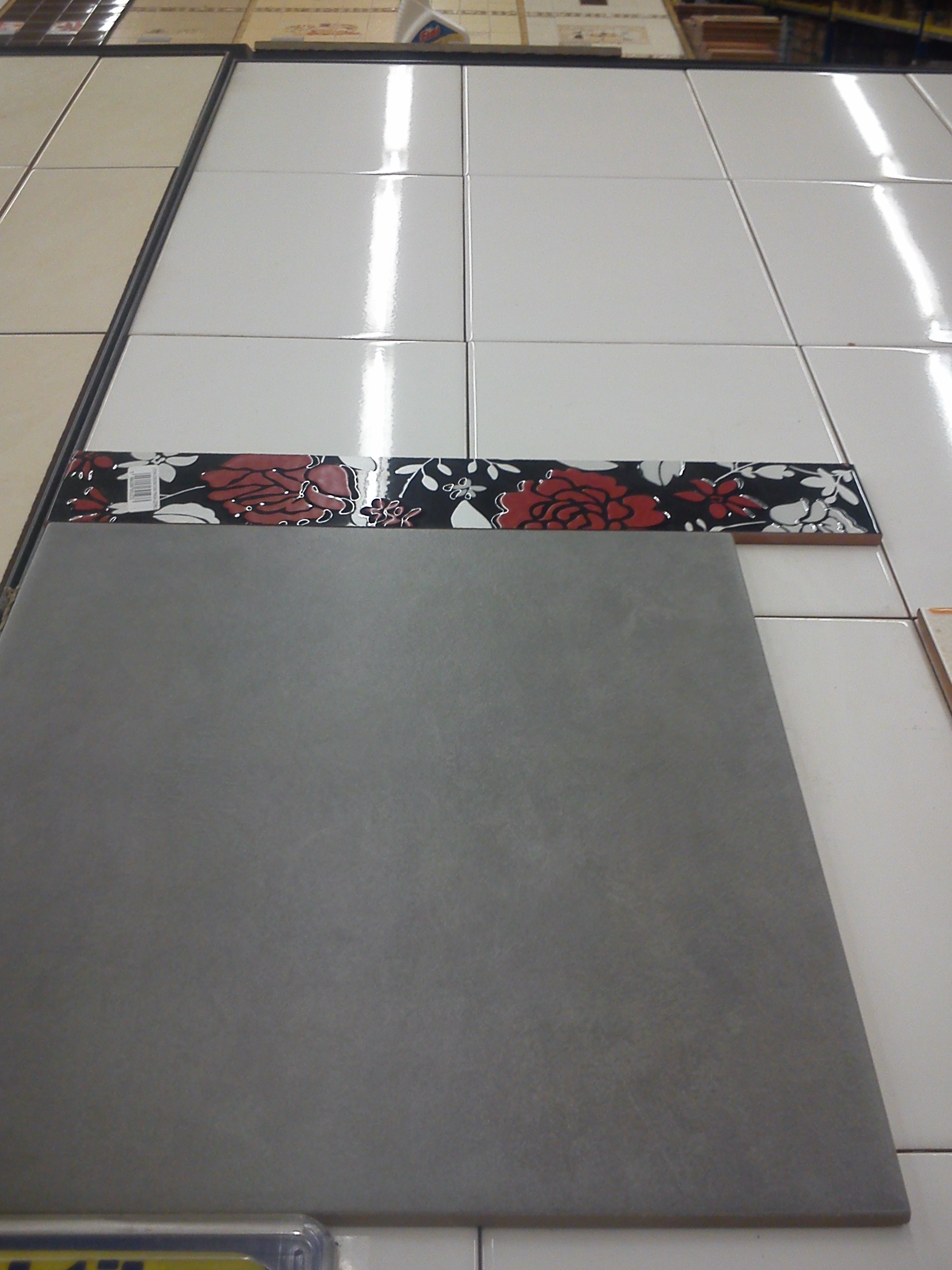 Do rzeczy – Praktiker wyprzedawał po 48 groszy sympatyczne dekory biało-czarne i biało-czarno-czerwone o długości 40 cm. Zakładając dwa paski tychże w łazience do wysokości kabiny mamy po 5 dekorów na pasek, co daje 4,80 zł. Można ich zrobić więcej, każdy pasek do wysokości 2 m kosztuje 2,40 zł. Do tego dobrałam najprostsze białe płytki z założeniem układania ich w poprzek oraz szarą podłogę. Jeśli chcemy wydać ciut więcej można wybrać płytki na ścianę w większym formacie (cały czas w bardzo dobrej cenie, lecz już ciut droższe niż wersja super podstawowa.