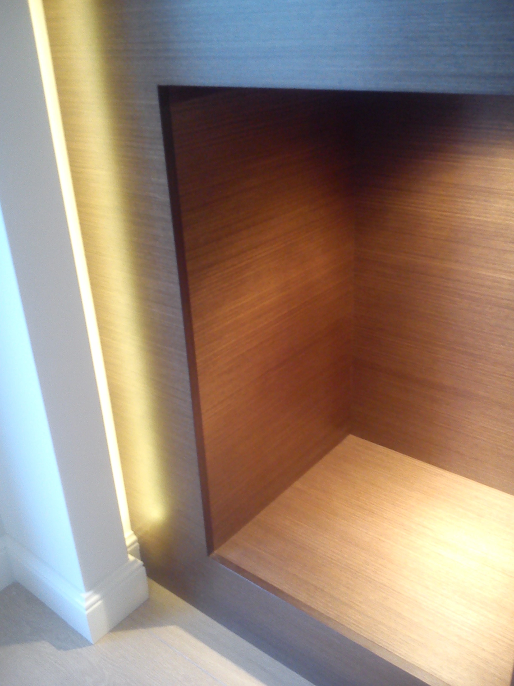 – kuchnia wyprowadzona z dotychczasowego miejsca, znajduje się praktycznie na środku mieszkania. Układ lodówka-blat roboczy z pojedynczym zlewem i dwupalnikową płytą indukcyjną (szerokość 146 cm), – na końcu słupek ze zmywarką i umieszczonym nad nią piekarnikiem.
