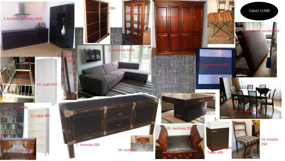 Do tego wnętrza wyszukałam meble w dość eleganckim stylu, trochę kolonialne, a trochę nowoczesne. Całość jest bardzo spójna stylistycznie, mimo że meble były „upolowane” na aukcjach i to jedynie tych wystawionych w Warszawie (nasi bohaterowie, chcąc oszczędzić na kosztach transportu, mogą wynająć na jeden dzień samochód przewozowy wraz z dwoma panami od przeprowadzek i zebrać wszystkie wybrane rzeczy). Do wybranych mebli pasować będą ciemne panele (raczej w odcieniu gorzkiej czekolady – wenge, dąb wędzony, aniżeli wpadające w czerwień – np merbau) i białe ściany. Tym razem podpięłam odnośniki, bo mebli jest sporo, ale oczywiście kiedy aukcje zakończą się nie będą one zbyt przydatne.