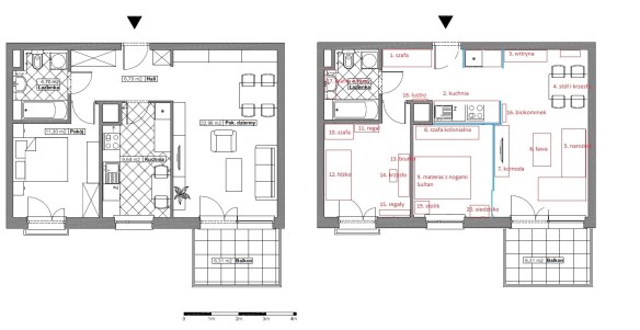 Mieszkanie jest dwupokojowe, jednak rodzina potrzebuje osobnego pokoju dla córki, a rodzicom zależy na sypialni. Biorąc pod uwagę ustawienie pionów spróbujmy nietypowego rozwiązania, a mianowicie kuchni w przedpokoju. Wtedy w obecnej kuchni zaaranżować można niewielką sypialnię dla rodziców, dostępną z pokoju dziennego dzięki przesuwanym drzwiom.