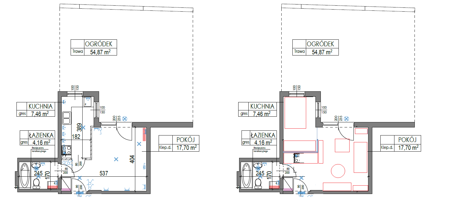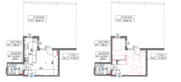 Kuchnia została przeniesiona do przedpokoju – zakładam że mieszkanka tego wnętrza woli mieć oddzielną sypialnię. Aneks kuchenny ma 210cm , nie udało mi się w aktualnie trwających aukcjach pasującej stylistycznie kuchni. Ikeowska (najchętniej biała błyszcząca) oczywiście załatwiłaby sprawę – schowana, zabudowana lodówka podblatowa 60 cm, szafka 60 na zlew, szafka 50 cm na zmywarkę i szafka 40 cm, a u góry taki sam podział, szafki 92 cm wysokości. Jednak dodatkowa wskazówka dla wszystkich meblujących się po partyzancku – warto udać się na wycieczkę szlakiem studiów mebli kuchennych i sprawdzić, czy nikt np nie zmienia ekspozycji, bo to okazja do naprawdę konkretnych przecen.