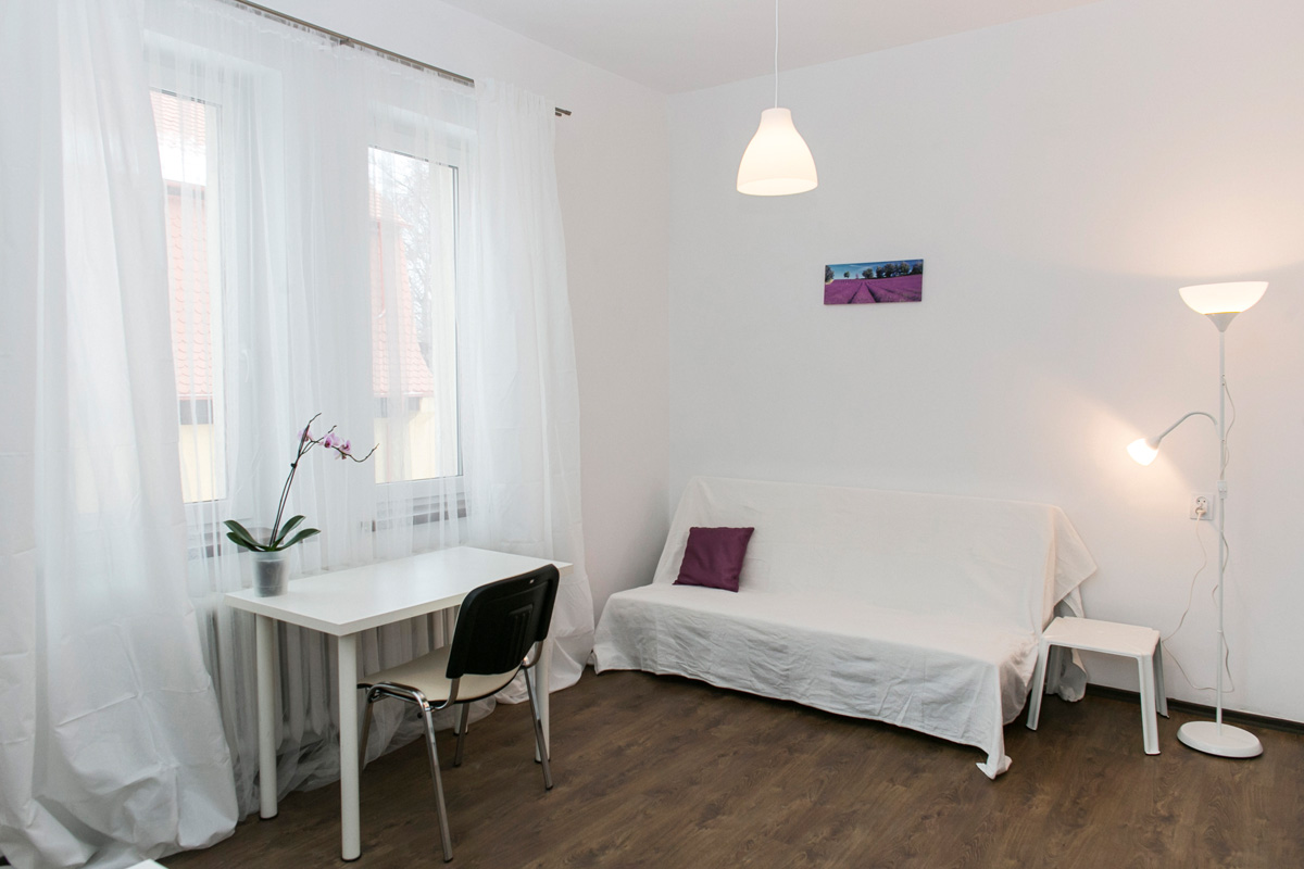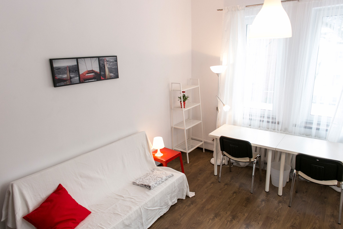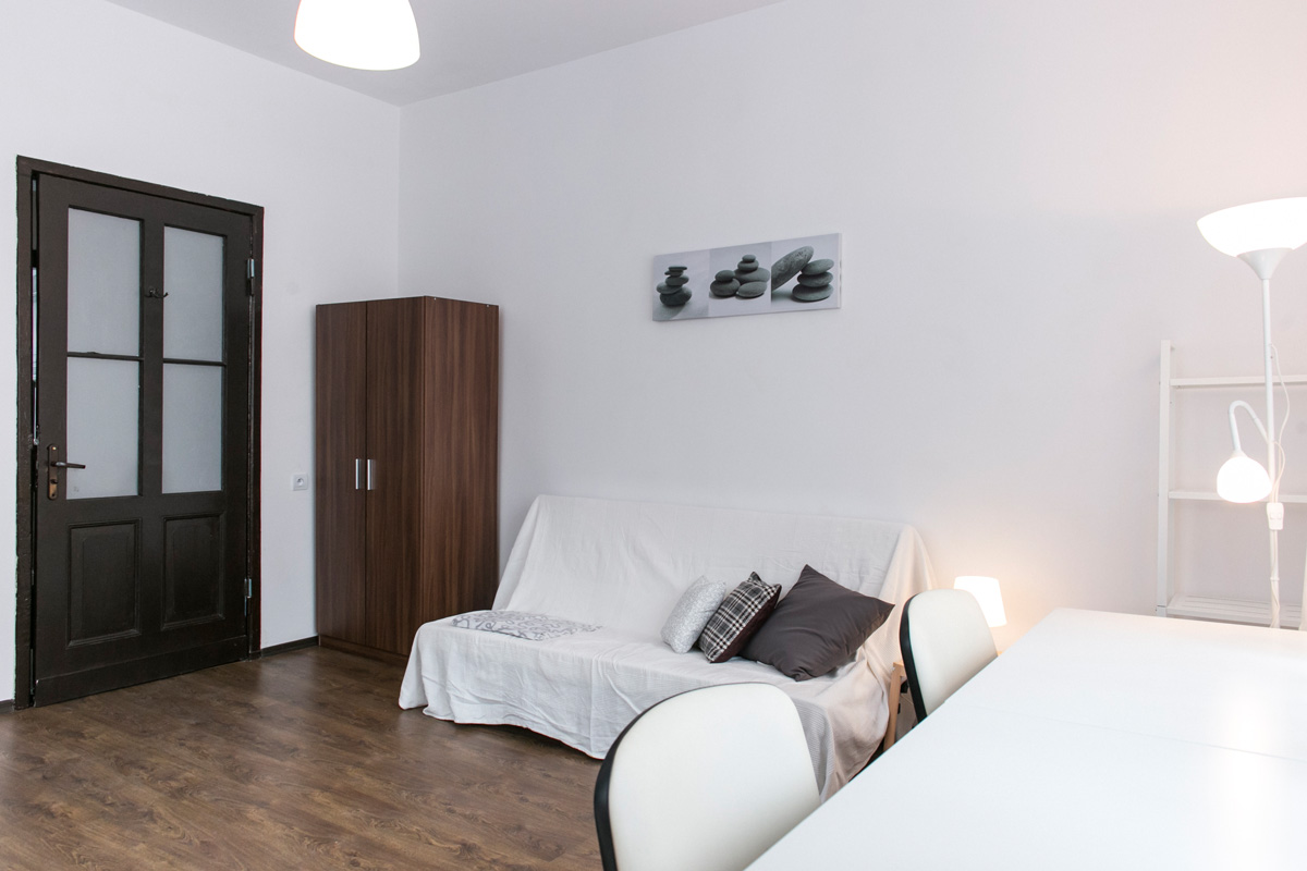 Po pierwsze, zmniejszyłam łazienkę do szerokości wanny (160 cm). Po drugie, dodałam przedpokój, z którego wchodzi się do sypialni – drzwi do sypialni mają spore przeszklenia, aby przedpokój był doświetlony. W mniejszej sypialni, która została przeznaczona dla mamy, nad wezgłowiem łóżka (wykonanym z desek podłogowych) znalazło się duże bezramowe lustro, które znacząco powiększa pokój. Łóżko może być złożone (gdy pokój ma stać się biurem) lub rozłożone – zmieści się nawet w szerokości 160 cm. Kuchnia została przeniesiona do dawnej sypialni, która stała się salonem.