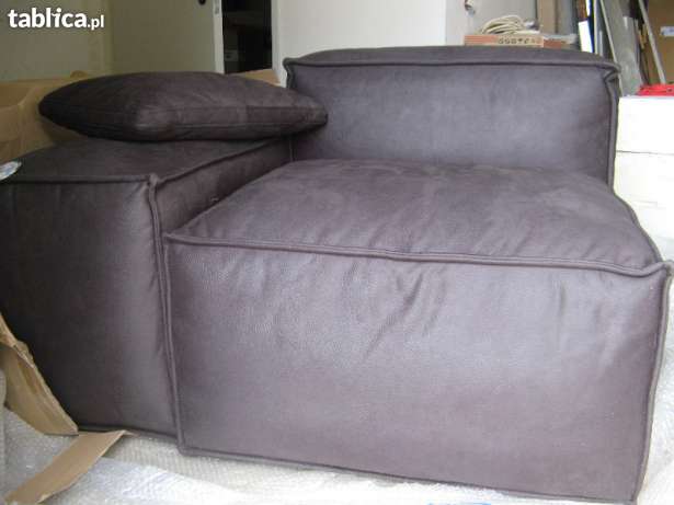 Szafa (na zdjęciu widać tylko fragment wnętrza) ma lustrzane, przesuwane drzwi i wymiar 200 x 200 x 65 cm. Łóżko ma dokładnie taki wymiar, jaki pasowałby za ściankę działową , a mianowicie 140 x 215 cm. Sofa jest rozkładana, tak więc nie ma problemu gdzie przenocować gości. Kuchnia mieści się na długiej ścianie i może się w nią elegancko wtopić (można ją rozłożyć i lodówkę postawić przy drzwiach, tak jak jest na oryginalnym rysunku dewelopera). Stół jest rozkładany. W tym układzie ścianę za łóżkiem pomalowałabym na szary kolor – odrobinę ciemniejszy od kuchennych frontów, a ściankę działową, która od strony pokoju dziennego staje się ścianką rtv, pomalowałabym na żywy pomarańcz (w kolorze poduszek z sofy) lub zostawiła białą, ale ceglaną (jeśli chcemy wyróżnić ją fakturą). Nad łóżkiem na pewno jakiś ciekawy obraz w tonacji biało-pomarańczowo-grafitowej, z odrobiną turkusu. Wicie już, gdzie takich szukać?