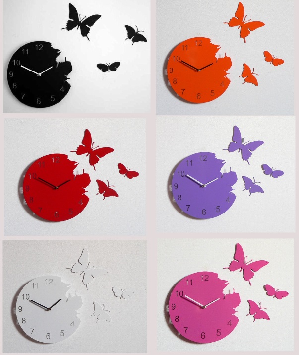 Na koniec podobny zegar, chyba najmniej podoba mi się ze wszystkich tu zgromadzonych motylkowych artefaktów, ale jednak coś w sobie ma.Jako kolorowy akcent na białej ścianie – czemu nie!